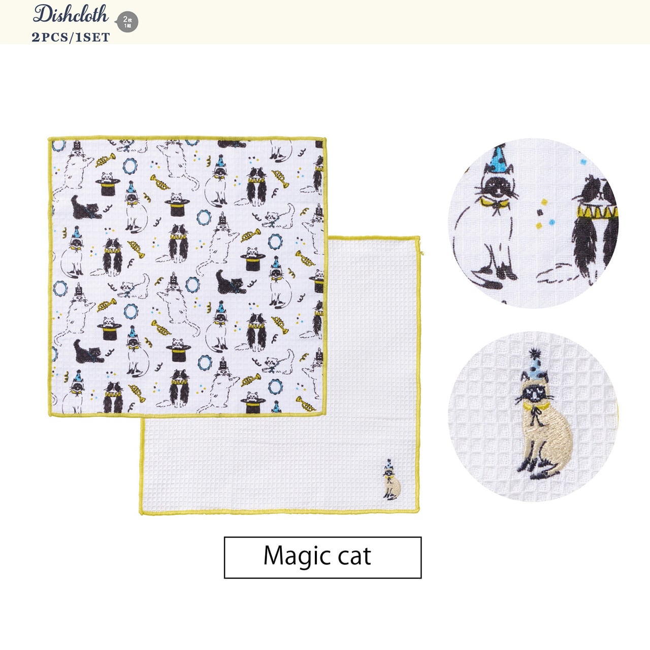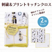 ワンポイント刺繍とプリント生地がかわいい2枚組のキッチンクロスです。さまざまな猫が勢ぞろい。可愛さあふれる癒しのデザイン。吸水性・通気性に優れ、季節を問わず快適に使えます。コードでまとめられているので、ギフトにもおすすめです♪