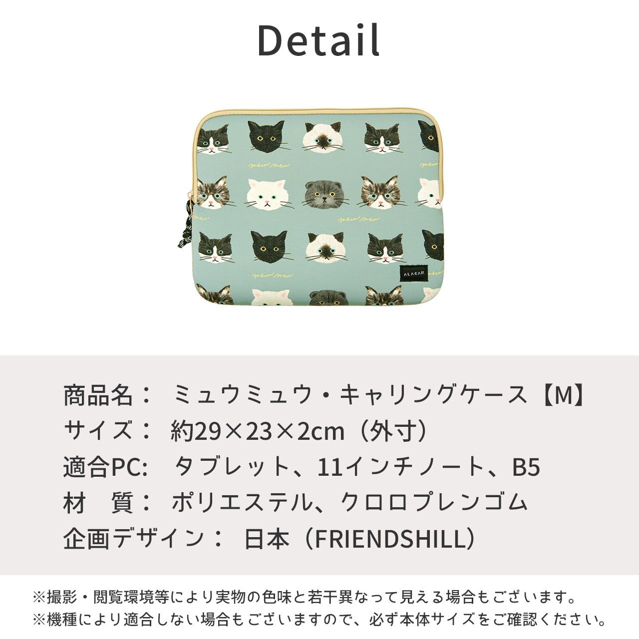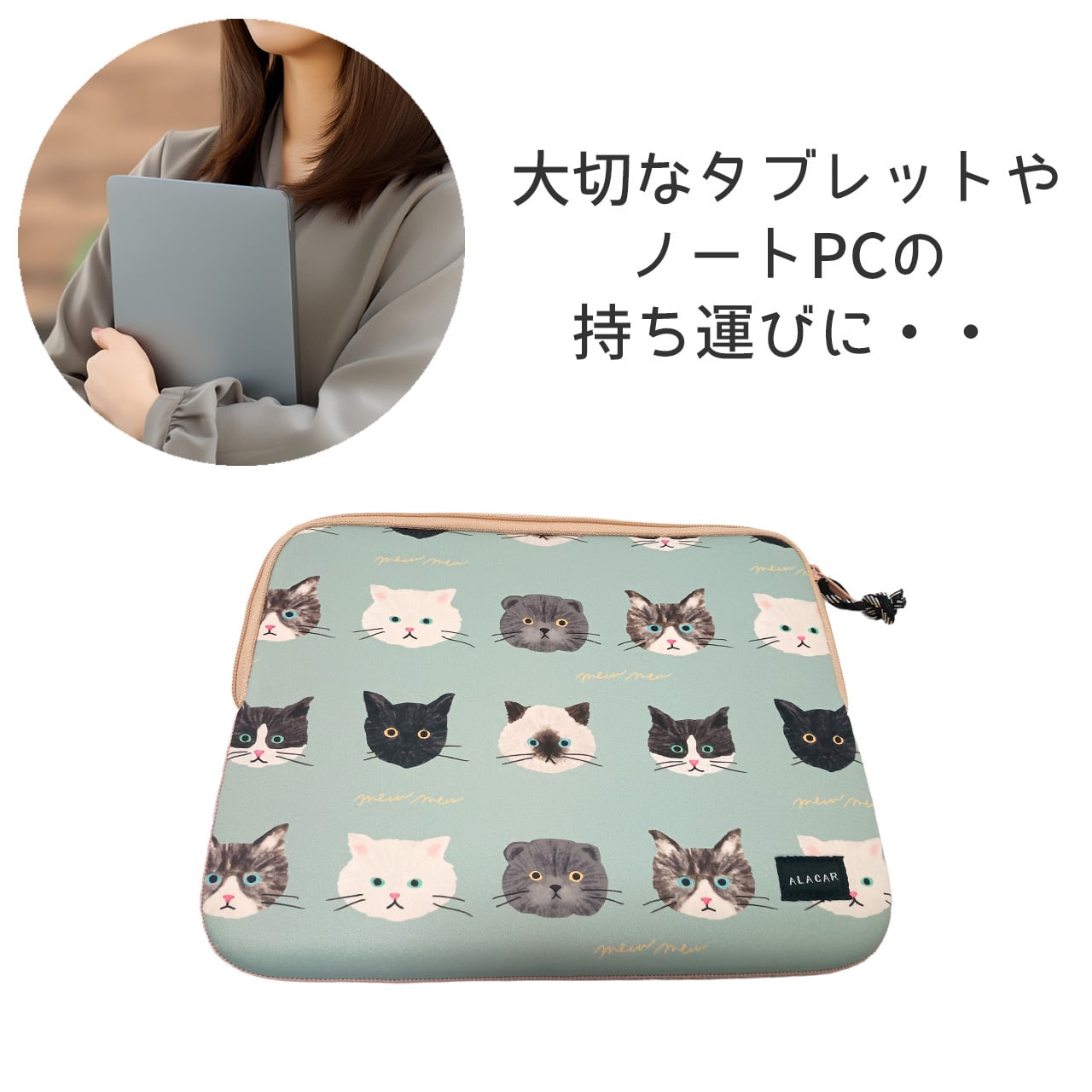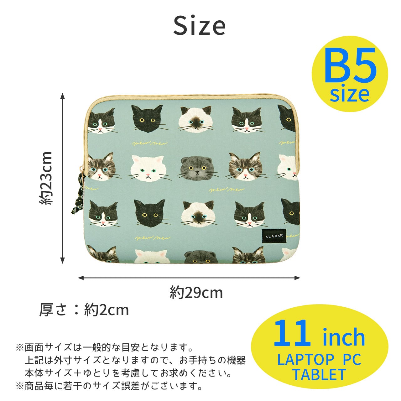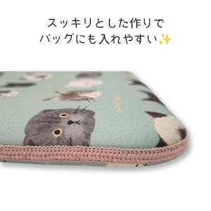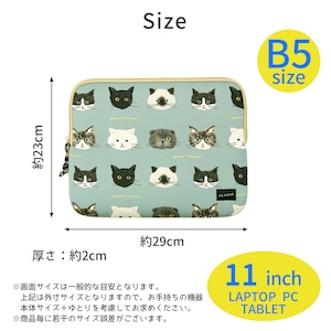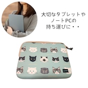 タブレットやB5サイズのノートPCにぴったりな、可愛い猫ちゃんいっぱいのキャリングケースです。軽量でかさばらないスッキリとしたデザインなので、かばんに入れやすく、弾力のあるクッション素材が大切なタブレットやモバイルPCを傷や衝撃から守ってくれます。B5クリアホルダーも入ります。