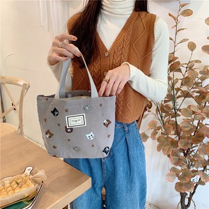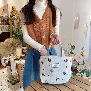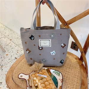 猫ちゃん ミニトート トートバッグ 小さめ ポケット付き 猫柄 ねこ ネコ バッグ 刺繍 かわいい 可愛い おしゃれ ランチトート お弁当箱 ランチボックス ミニサイズ コットン キャンバス ベージュ グレー ブラック 韓国風 猫雑貨 猫グッズ プレゼント ギフト【027】